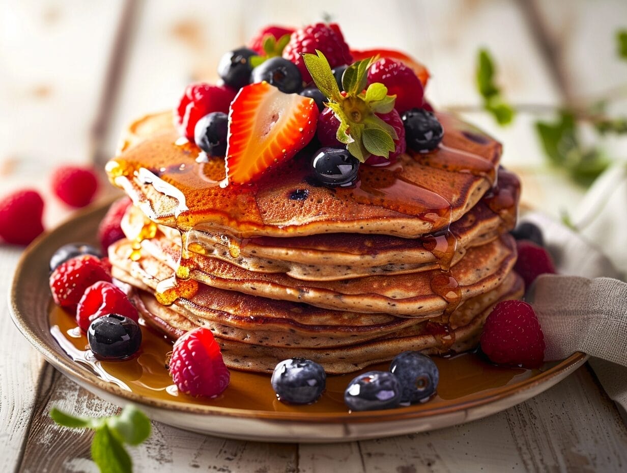 • Serve the pancakes topped with mixed berries and a drizzle of maple syrup.